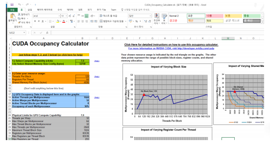 설계된 kernel과 thread layout에 따른 occupancy를 계산해준다. (참고만 하도록 하자.)