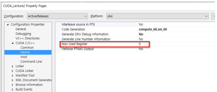 CUDA C/C++의 Device에 가보면 Max Used Register를 통해 사용되는 Register의 수를 제한할 수 있다.