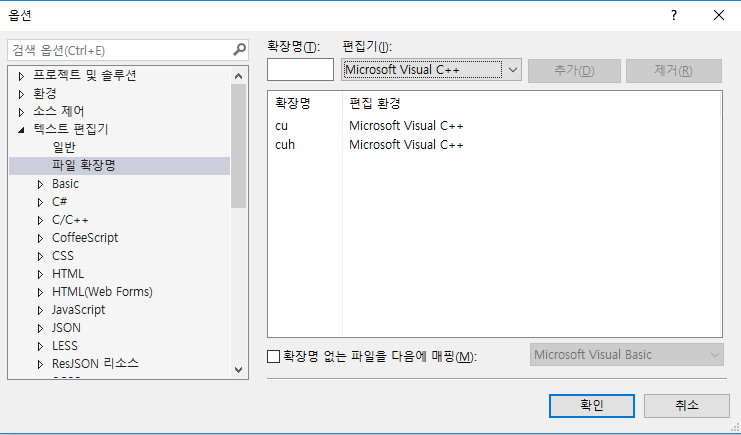 따라서 "도구 → 옵션 → 텍스트 편집기 → 파일 확장명"으로 들어가